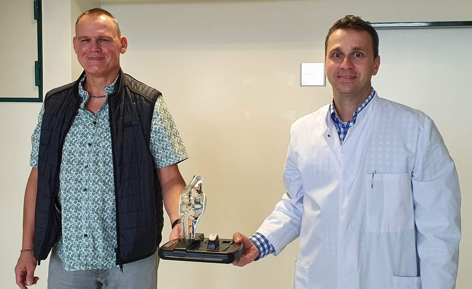 "Das Knie war aufgrund des nicht operierten Kreuzbandrisses chronisch instabil, erklärte Dr. Könighaus. Dadurch kam es zu einer Arthrose, die das Kniegelenk schädigte. Aufgrund der Vorerkrankungen kam es nicht in Frage, den Schaden in zwei Operationen zu beheben. "In einem Kombinationseingriff wurde das Kreuzband durch eine körpereigene Sehne ersetzt und eine Teilprothese in das Knie eingefügt", so Dr. Könighaus, der bewusst keine Vollprothese für das Knie wählte, um für die Zukunft alle Optionen für eine optimale Versorgung des Knies offen zu halten.