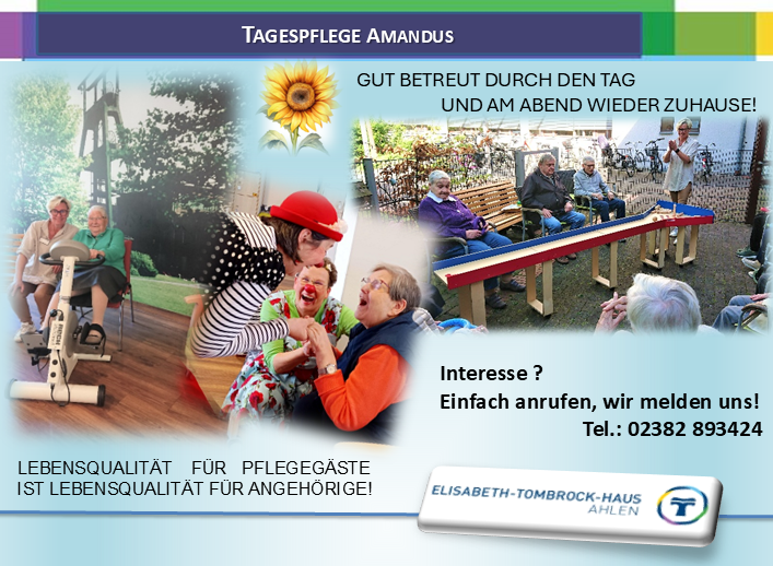 Der Tag in Amandus beginnt mit einem freundlichen Willkommen und einem gemeinsamen Frühstück. Danach folgen abwechslungsreiche Angebote: Gesprächsrunden, gemeinsam Zeitung lesen, Musik hören oder gemeinsam singen, Förderung der Mobilität, Spiele, Gedächtnisübungen, kreatives Arbeiten und Entspannungseinheiten. Das Besondere: Nichts muss, vieles darf. Die Lebensgeschichte jeden Gastes wird einbezogen, sodass Interessen und frühere Gewohnheiten den Tag mitgestalten können. Durch die Anbindung an das Elisabeth‑Tombrock‑Haus profitieren die Gäste von kulturellen und spirituellen Angeboten wie Gottesdiensten oder Musikveranstaltungen. Gleichzeitig bleibt die Tagespflege ein eigener, überschaubarer und geschützter Raum, um soziale Kontakte zu pflegen und Einsamkeit vorzubeugen.